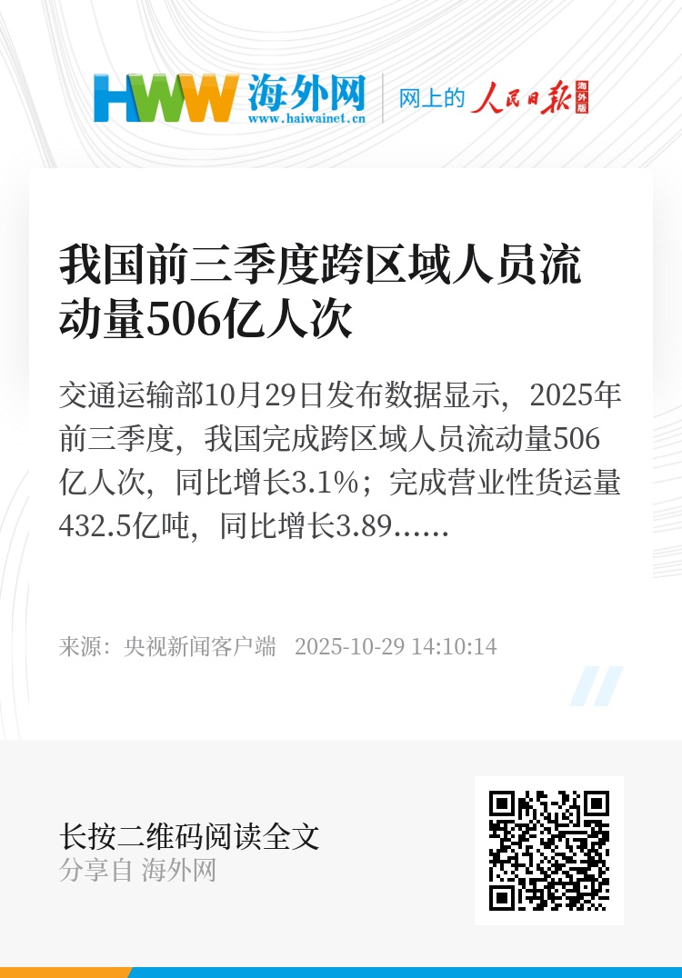 交通运输部10月29日发布数据显示,2025年前三季度,我国完成跨区域人员流动量506亿人次,同比增长3.1%;完成营业性货运量432.5亿吨,同比增长3.89%;完成港口货物吞吐量135.7亿吨,同比增长4.6%;完成交通固定资产投资2.6万亿元。