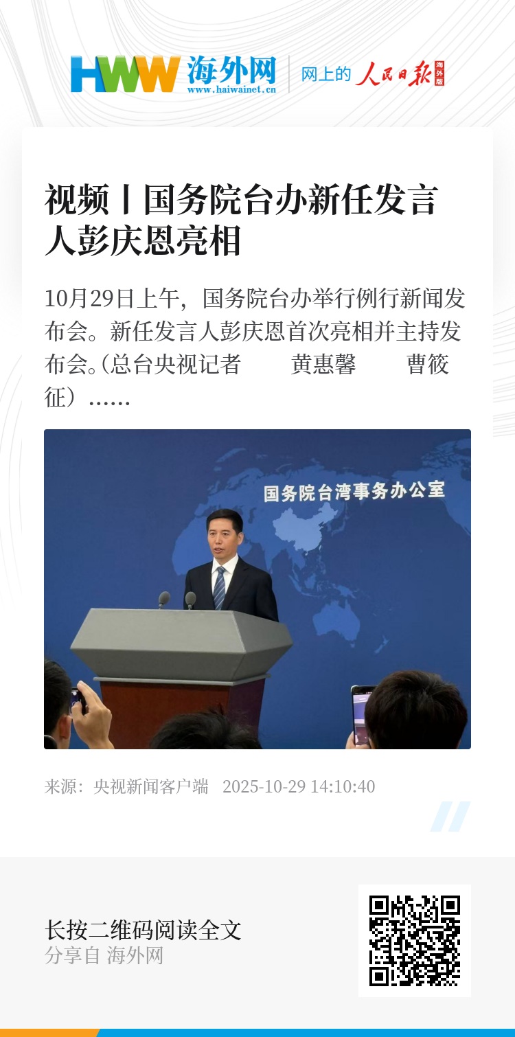 10月29日上午,国务院台办举行例行新闻发布会。新任发言人彭庆恩首次亮相并主持发布会。