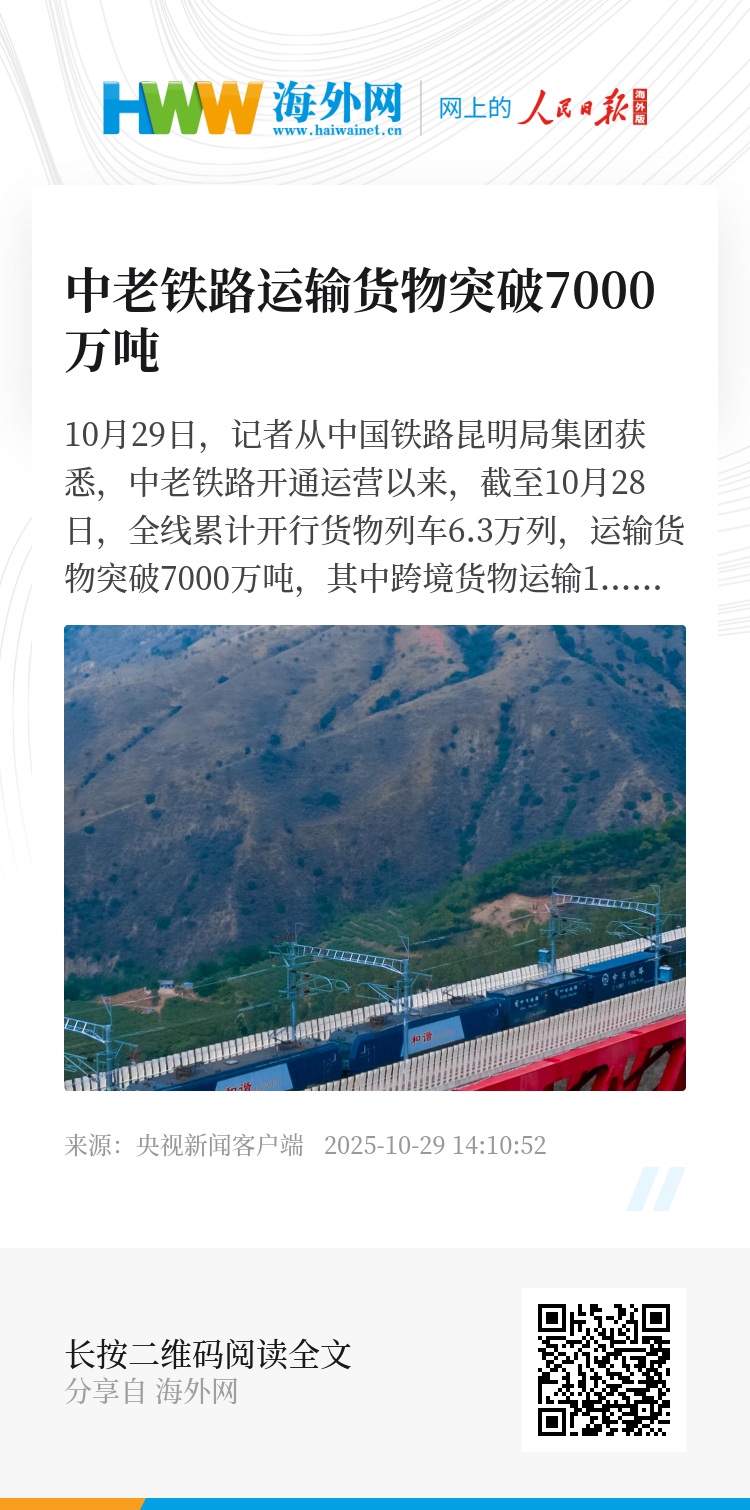 10月29日,记者从中国铁路昆明局集团获悉,中老铁路开通运营以来,截至10月28日,全线累计开行货物列车6.3万列,运输货物突破7000万吨,其中跨境货物运输1600万吨,辐射19个国家和地区,尤其今年以来货物运输量、跨境货物量均保持两位数的强劲增长,中老铁路已成为一条联通内外、辐射周边、双向互济的黄金线路。