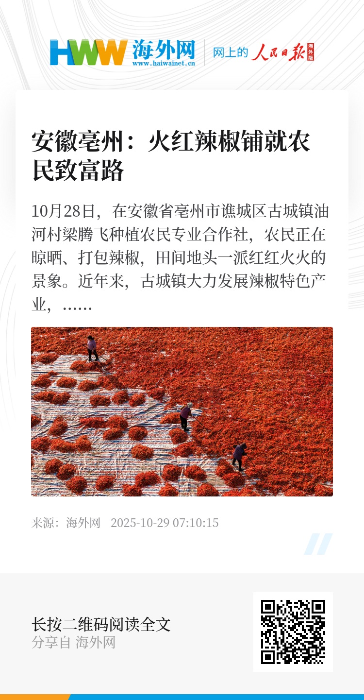 10月28日,在安徽省亳州市谯城区古城镇油河村梁腾飞种植农民专业合作社,农民正在晾晒、打包辣椒,田间地头一派红红火火的景象。近年来,古城镇大力发展辣椒特色产业,同时采用小麦、药材、西瓜与辣椒间混套作种植模式,提高土地利用率和产出率,促进农业增效、农民增收。图源:视觉中国