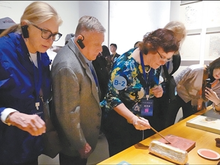 参加第七届中美友城大会的嘉宾在浙江省非物质文化遗产馆体验木版水印艺术。