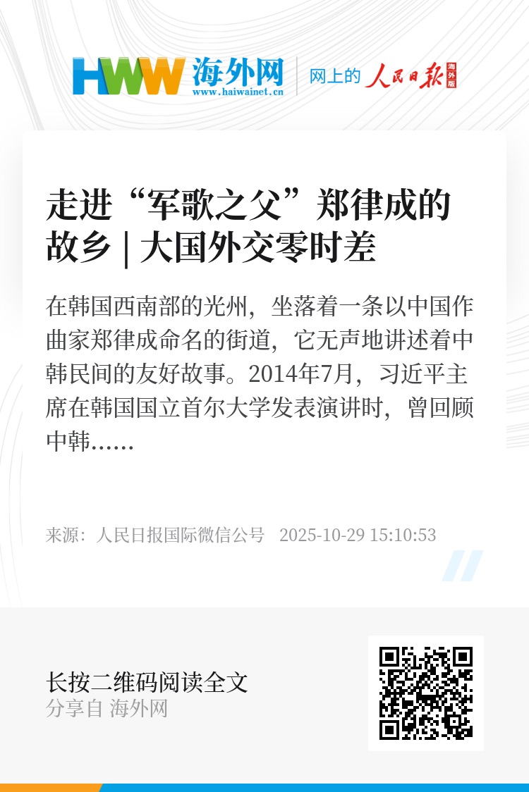 在韩国西南部的光州,坐落着一条以中国作曲家郑律成命名的街道,它无声地讲述着中韩民间的友好故事。