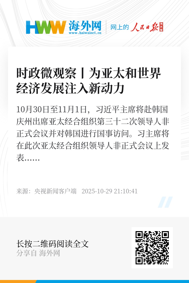 中国积极推进创新合作、绿色合作,助力加快亚太和全球经济数字化、绿色化、智能化进程,不断为亚太开放合作打开增量空间,为地区发展蓄积强劲动能。