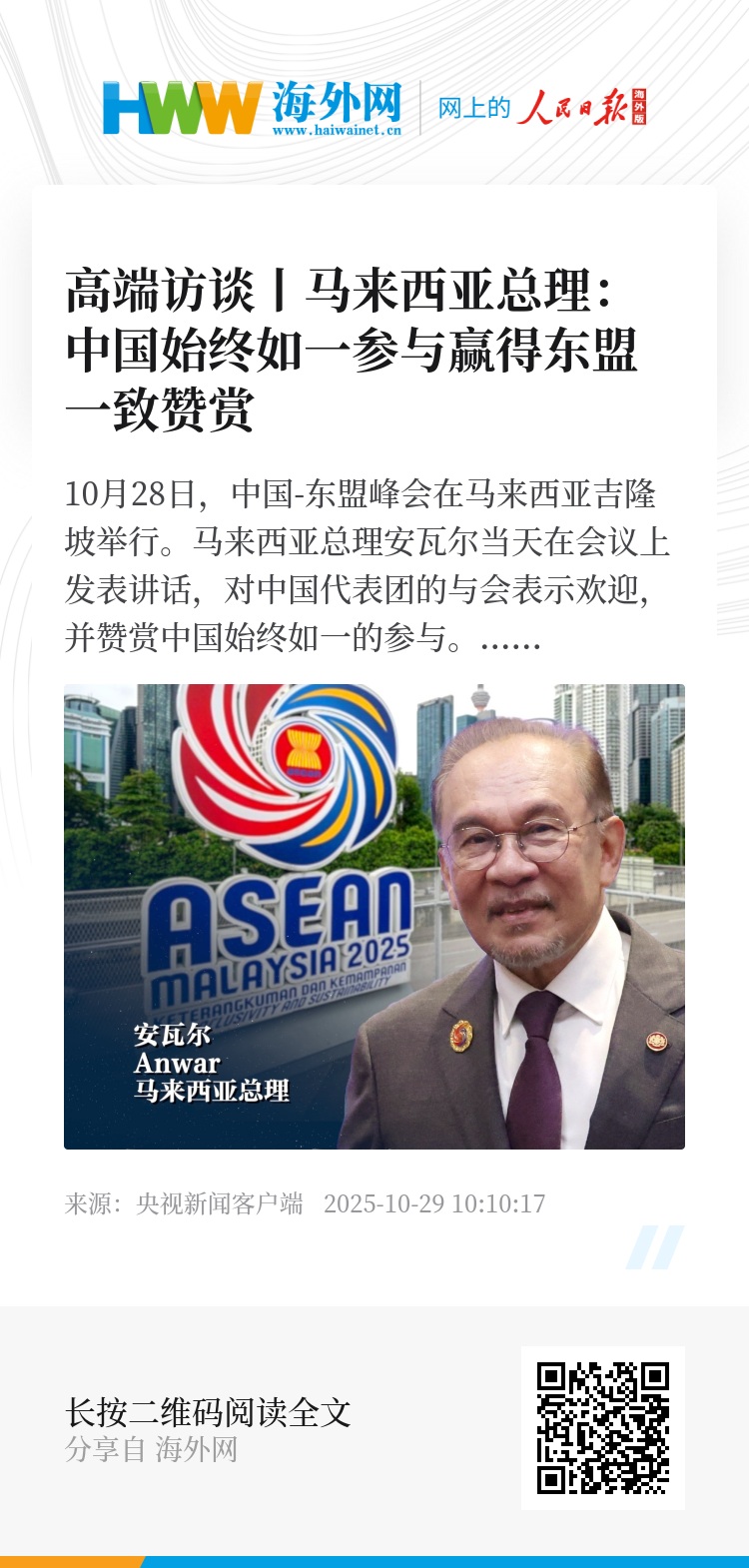 高端访谈丨马来西亚总理:中国始终如一参与赢得东盟一致赞赏