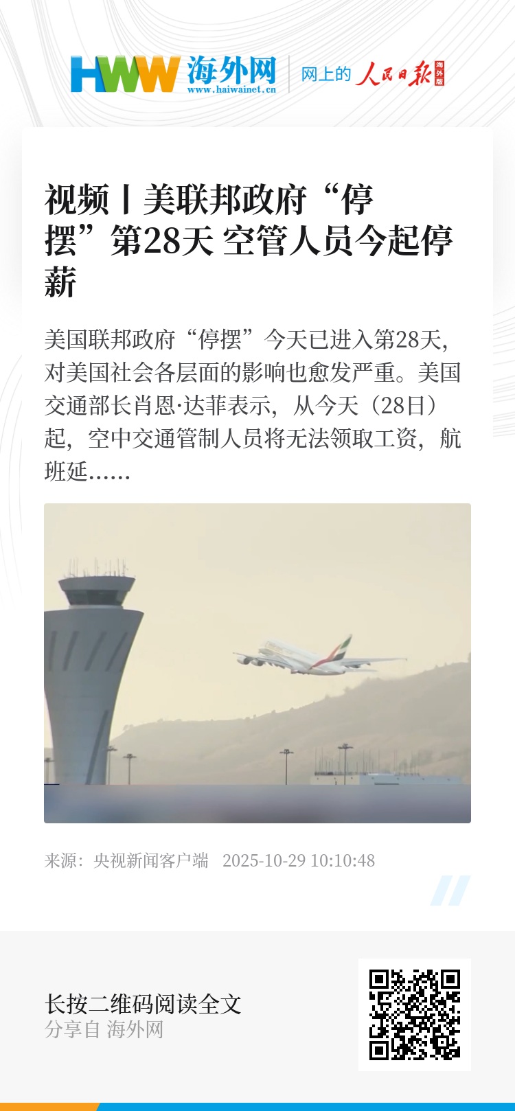 美国联邦政府“停摆”今天已进入第28天,对美国社会各层面的影响也愈发严重。美国交通部长肖恩·达菲表示,从今天(28日)起,空中交通管制人员将无法领取工资,航班延误或者取消的情况会随之加重。