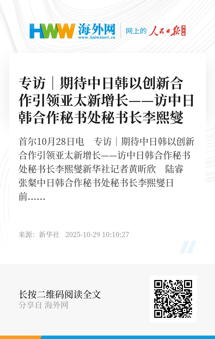 作为中日韩合作秘书处秘书长,李熙燮曾多次到访中国。谈及访问中国的感受,他说,中方重点推进发展数字化与人工智能技术、绿色产业及科技创新,大力发展新质生产力,这为中国乃至全球可持续发展提供动力。