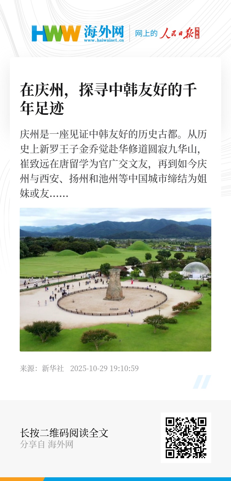 庆州是一座见证中韩友好的历史古都。从历史上新罗王子金乔觉赴华修道圆寂九华山,崔致远在唐留学为官广交文友,再到如今庆州与西安、扬州和池州等中国城市缔结为姐妹或友好城市,庆州与中国各地的友好交往佳话比比皆是。