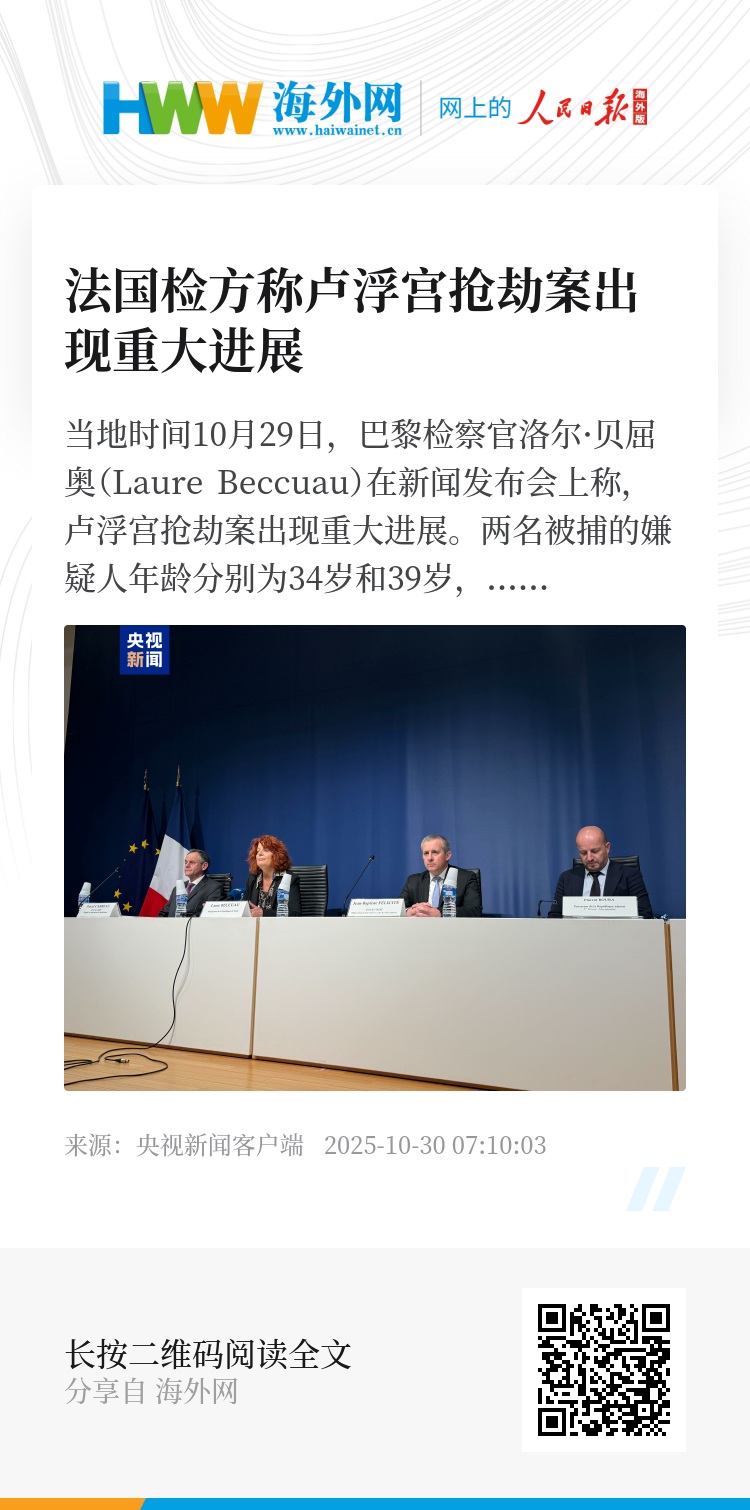 当地时间10月29日,巴黎检察官洛尔·贝屈奥(Laure Beccuau)在新闻发布会上称,卢浮宫抢劫案出现重大进展。