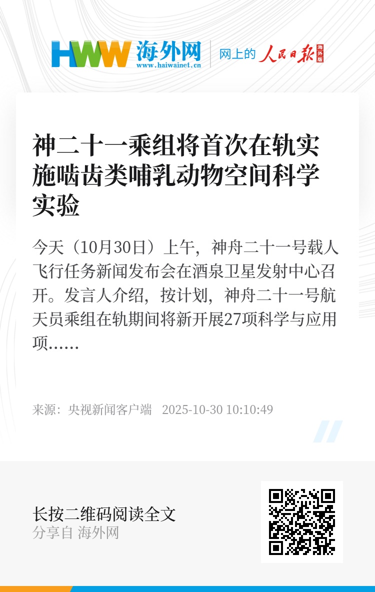 此外,神舟二十一号还上行了面向空间应用的锂离子电池电化学光学原位研究、空间站在轨智能算力平台试验等搭载项目,将为后续开展科学研究提供依据,为在轨应用进一步奠定基础。