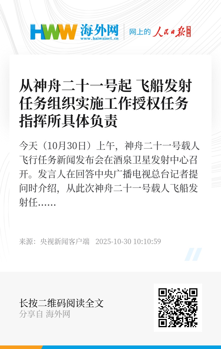 发言人在回答中央广播电视总台记者提问时介绍,从此次神舟二十一号载人飞船发射任务起,将飞船发射任务组织实施工作授权任务指挥所具体负责。
