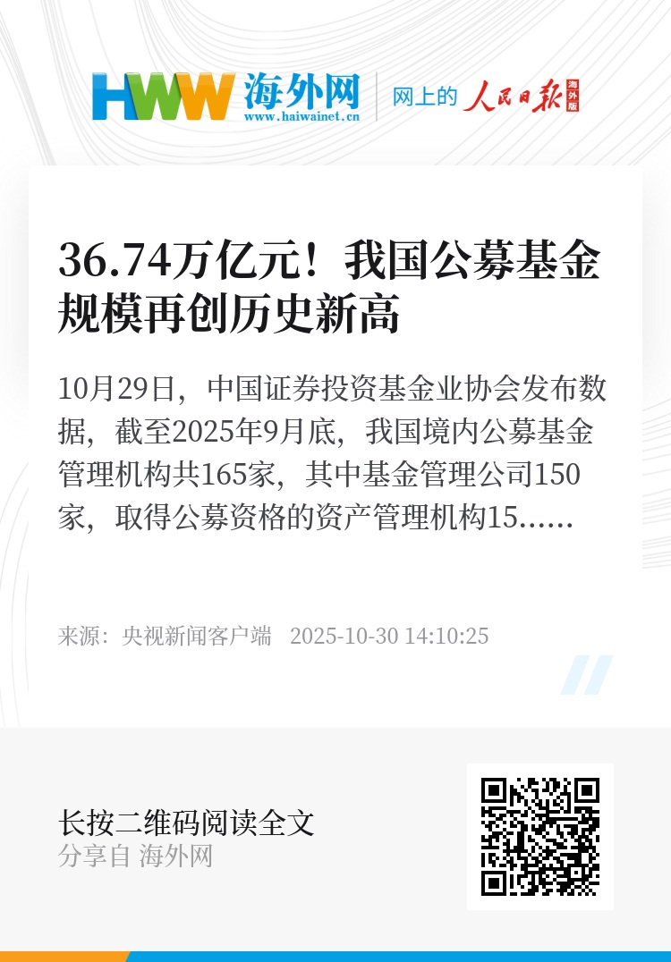 10月29日,中国证券投资基金业协会发布数据,截至2025年9月底,我国境内公募基金管理机构共165家,其中基金管理公司150家,取得公募资格的资产管理机构15家。以上机构管理的公募基金资产净值合计36.74万亿元,这也是继8月底公募基金规模首次突破36万亿元后再创新高。