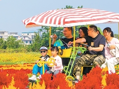10月26日,游客在广西壮族自治区贺州市富川瑶族自治县神仙湖慢城花海景区赏花游玩。高如金摄(人民图片)