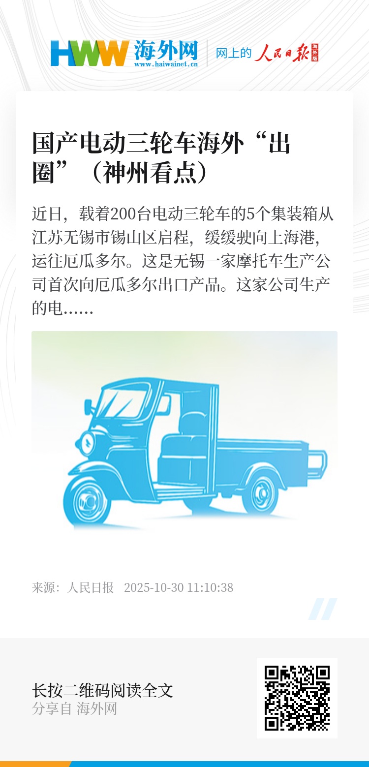 国产电动三轮车的出海之旅,是中国制造转型升级的生动缩影——凭借性价比打开市场,通过创新力赢得发展,不仅让“三蹦子”这一传统产品焕发新活力,更向世界展示了中国制造业的创新实力。(人民日报通讯员 白 雪 王 起)