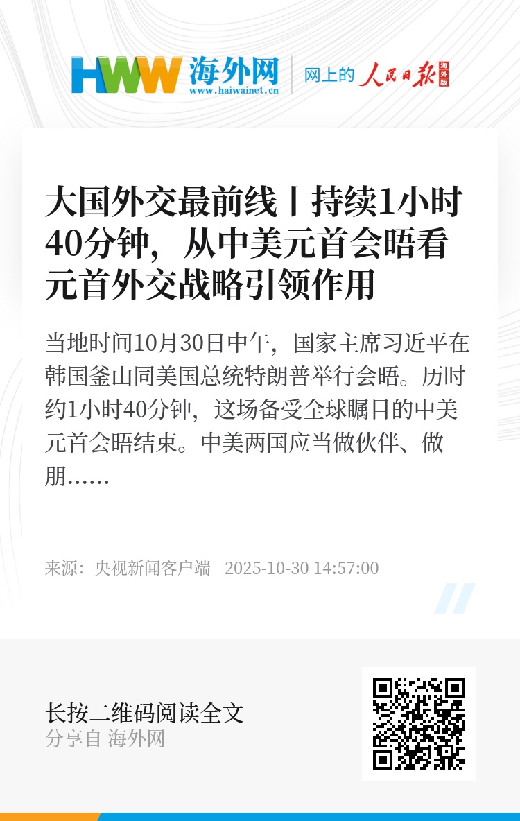 当地时间10月30日中午,国家主席习近平在韩国釜山同美国总统特朗普举行会晤。历时约1小时40分钟,这场备受全球瞩目的中美元首会晤结束。