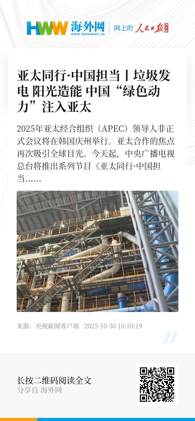 聚焦于中国在推动亚太绿色发展、能源转型与可持续合作中的担当与行动,本期将播出第三集:《垃圾发电 阳光造能 中国“绿色动力”注入亚太》。