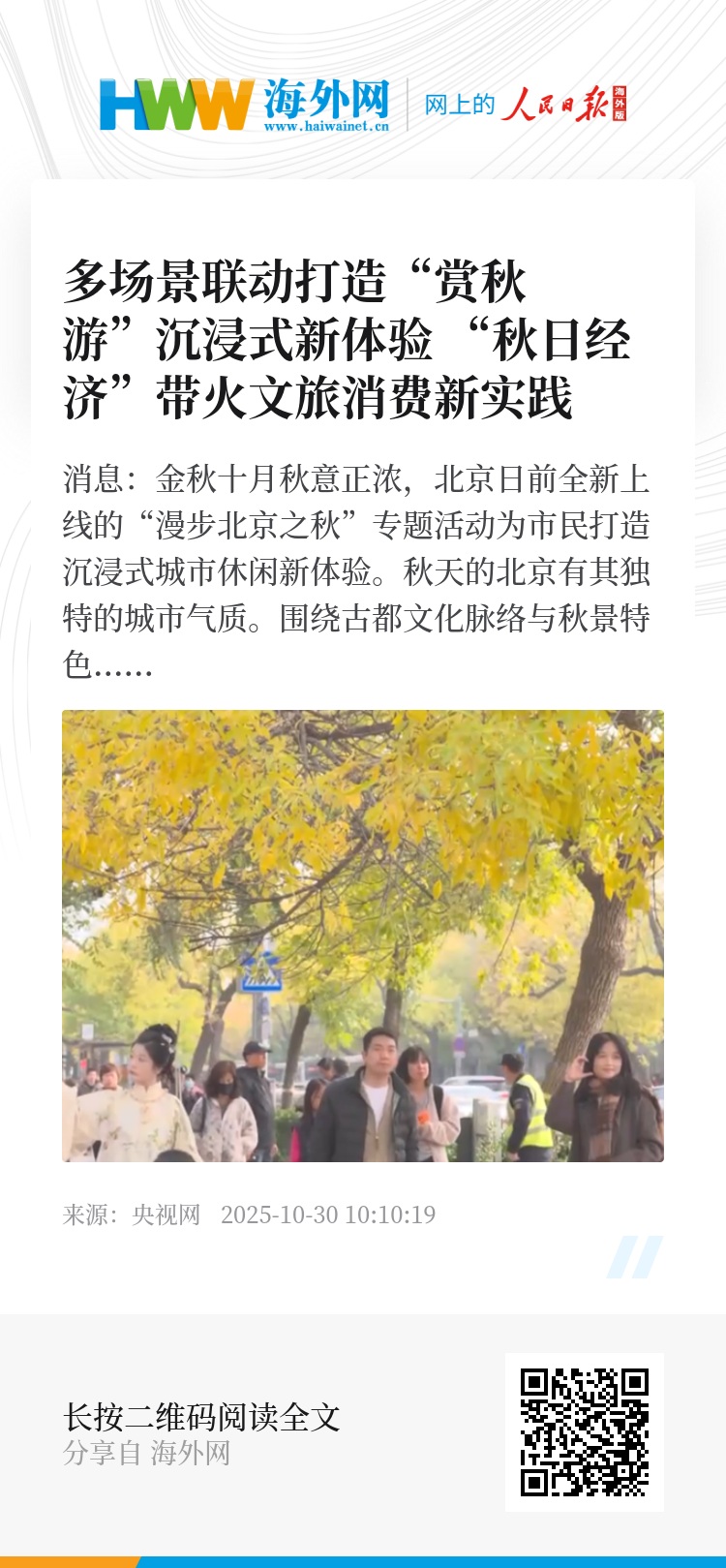央视网消息:金秋十月秋意正浓,北京日前全新上线的“漫步北京之秋”专题活动为市民打造沉浸式城市休闲新体验。