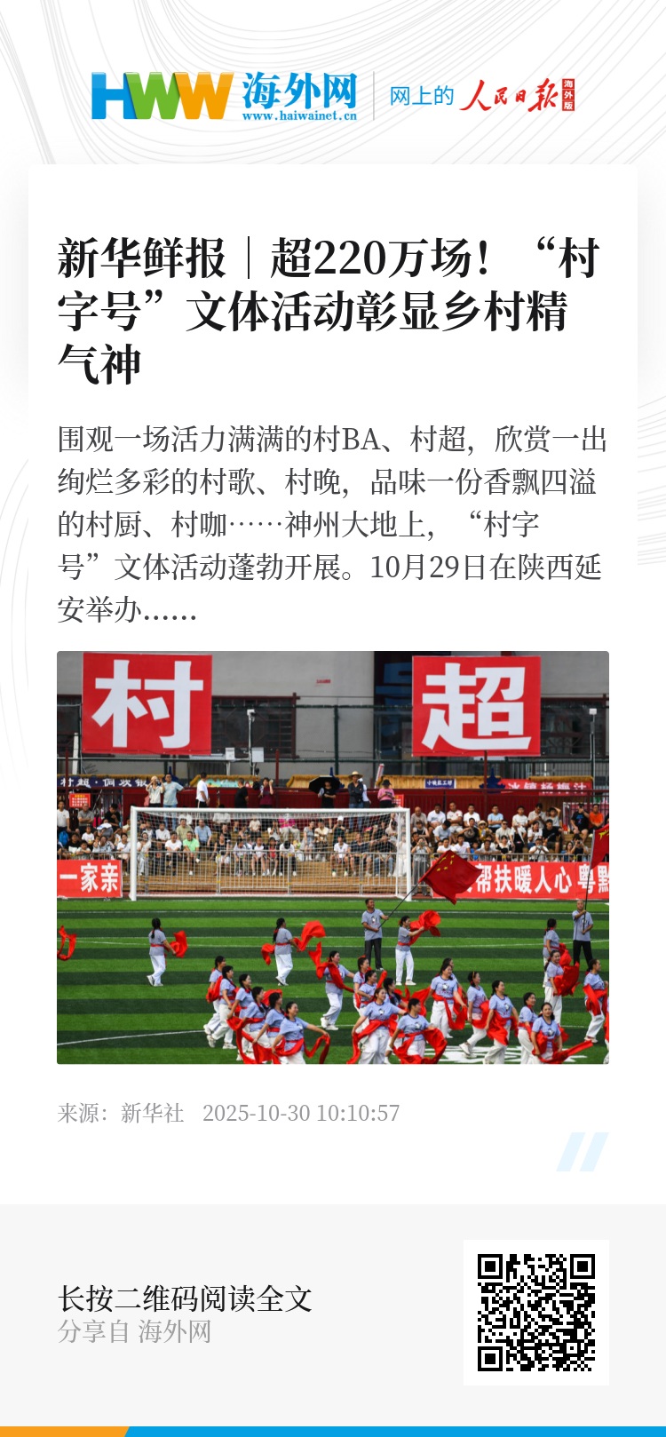 10月29日在陕西延安举办的中国文明乡风大会上,首份《全国“村字号”文体活动情况报告》发布。报告显示,全国“村字号”活动类型多达24种,2024年全国农村累计举办各类文体活动超过220万场。