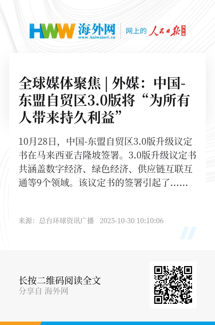 报道说,作为彼此最大的贸易伙伴,中国与东盟不断增长的贸易规模在很大程度上体现出该区域制造业、供应链一体化趋势不断增强。报道认为,中国-东盟自贸区3.0版升级议定书签署正值双方希望进一步加强双边关系之际,是“共赢的结果”。