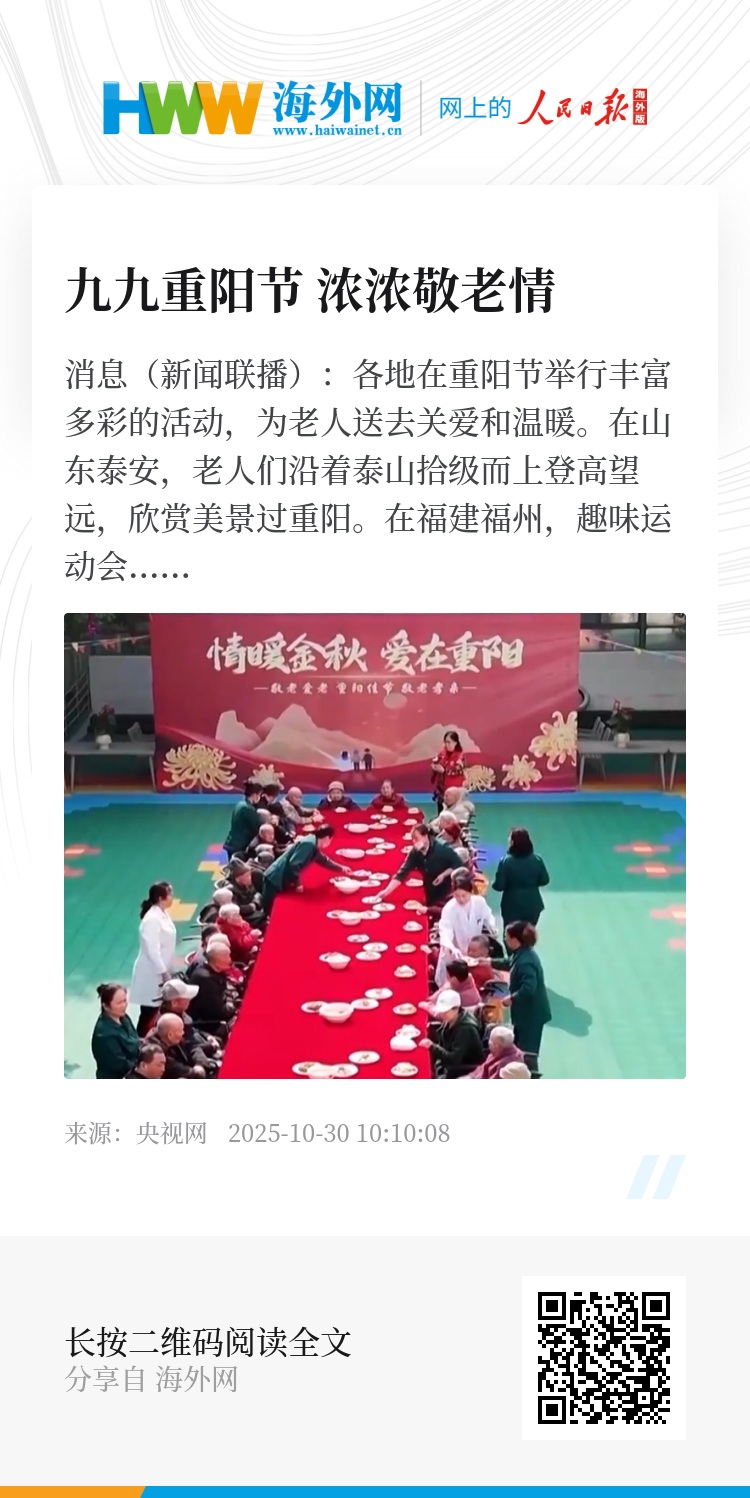 爱满重阳节,浓浓敬老情。在浙江平湖、安徽淮南等地,老人们聚在一起话家常,共享长桌宴,热气腾腾的重阳糕饱含着对老人们健康长寿、幸福安康的美好祝愿。在上海闵行,打糕、剪纸、竹编等传统技艺展示和体验吸引了众多老年人参与,大家一同感受传统文化的魅力。在黑龙江北安,医务人员走进养老护理中心为老年人进行义诊服务,送去“重阳健康礼”。