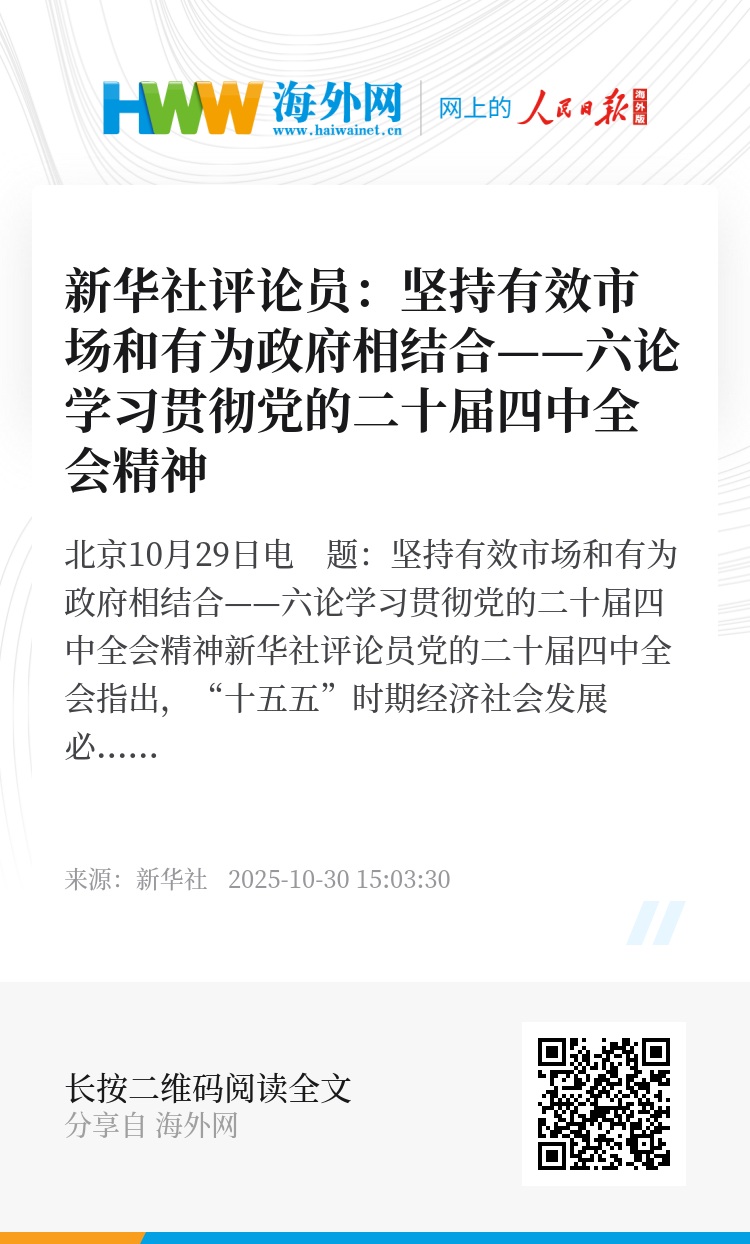 新华社北京10月29日电 题:坚持有效市场和有为政府相结合——六论学习贯彻党的二十届四中全会精神