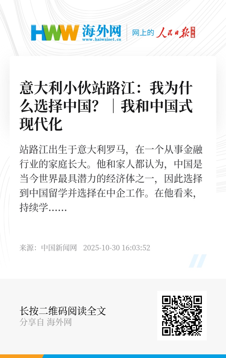 站路江出生于意大利罗马,在一个从事金融行业的家庭长大。他和家人都认为,中国是当今世界最具潜力的经济体之一,因此选择到中国留学并选择在中企工作。在他看来,持续学习、持续优化的能力等因素,让中国在面对各种挑战时,能够快速反应、灵活调整。他相信,中国式现代化不仅会继续为本国带来发展,也会为全球提供更多新思路和新方案。