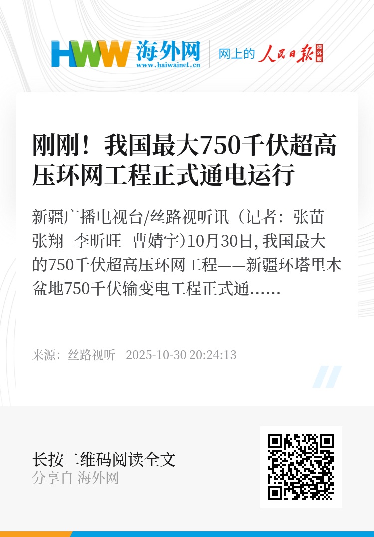 新疆广播电视台/丝路视听讯(记者:张苗 张翔 李昕旺 曹婧宇)10月30日,我国最大的750千伏超高压环网工程——新疆环塔里木盆地750千伏输变电工程正式通电运行。