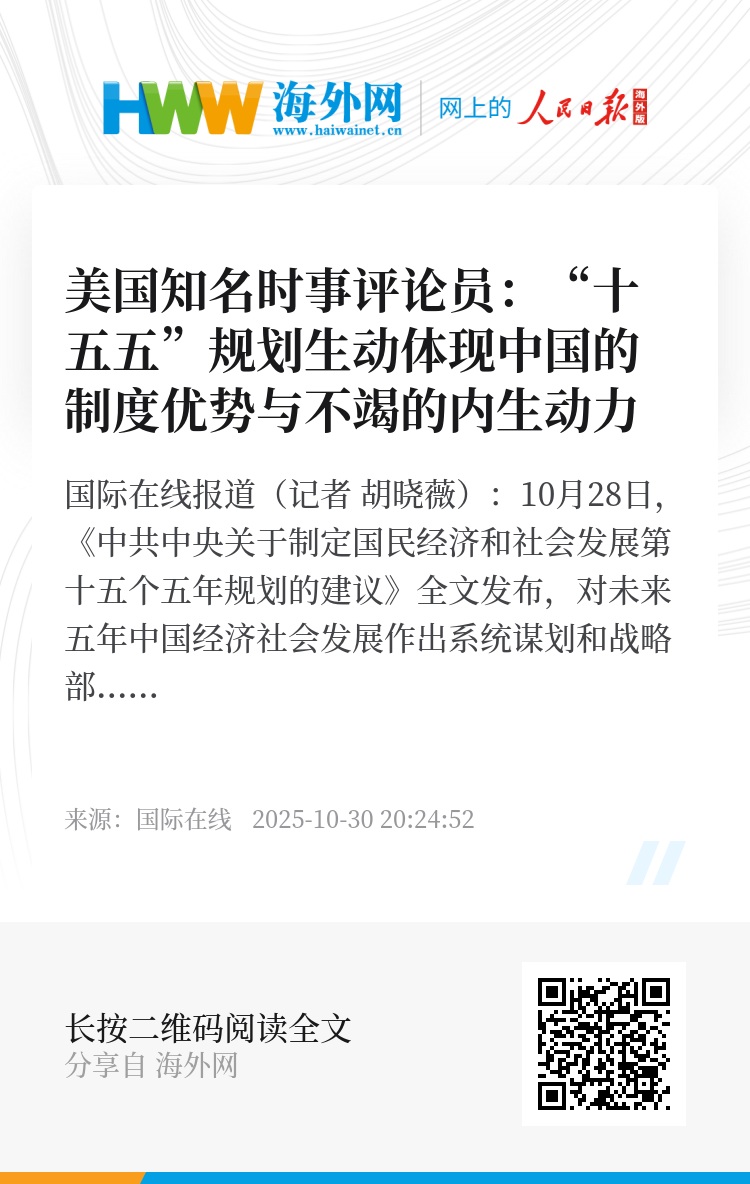 国际在线报道(记者 胡晓薇):10月28日,《中共中央关于制定国民经济和社会发展第十五个五年规划的建议》全文发布,对未来五年中国经济社会发展作出系统谋划和战略部署,获得国际社会广泛关注。美国知名时事评论员、国际问题专家艾那・唐根(Einar Tangen)在接受国际在线记者专访时表示,这份《建议》不仅为“十五五”时期描绘了清晰的发展蓝图,更深刻体现了中国将制度优势转化为发展效能的治理智慧。