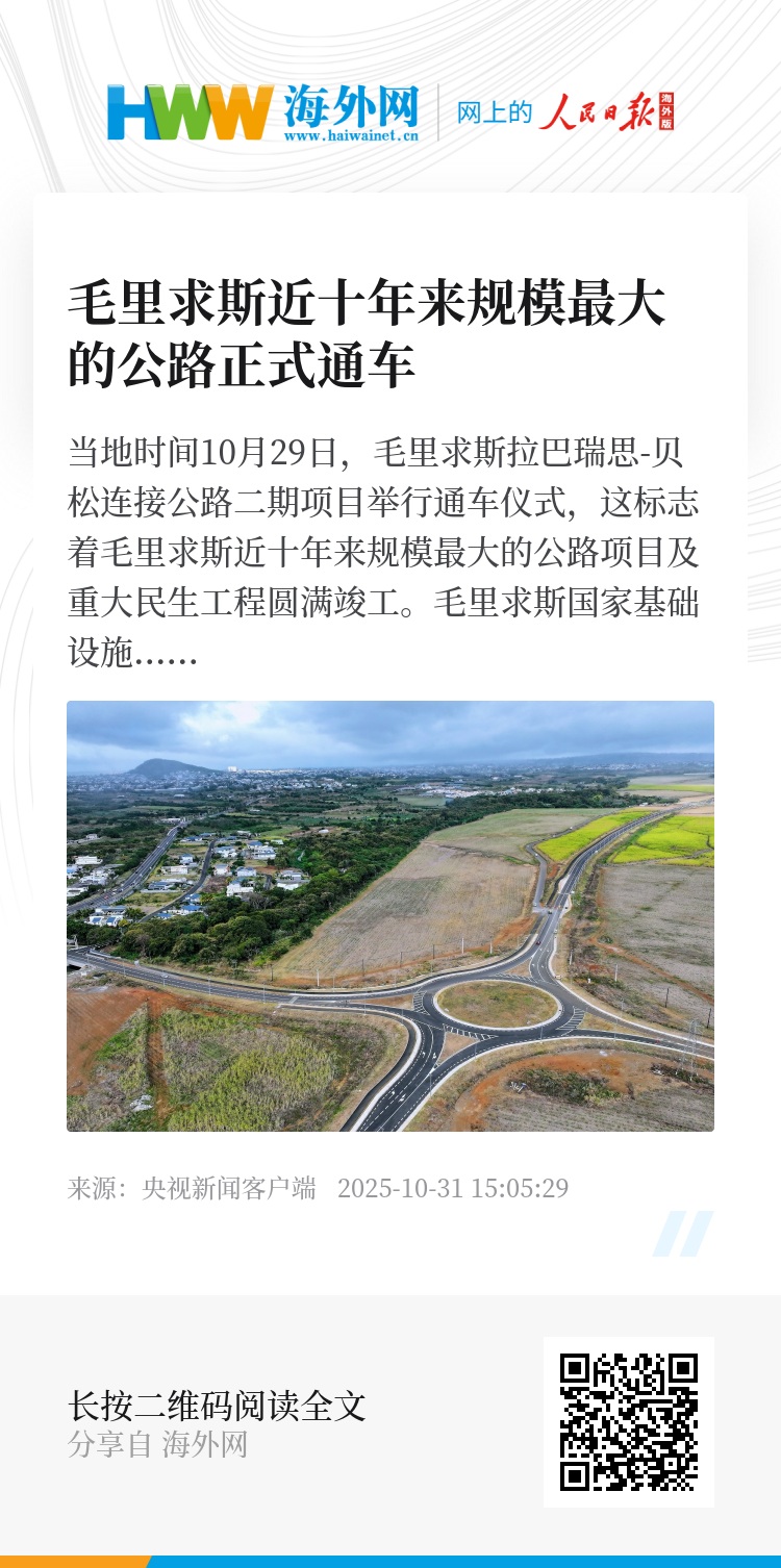 这条道路由中国企业修建,作为毛里求斯西部公路网络的“关键一环”,建成后成功串联起区域主要交通干线,有效解决数万居民的日常出行难题,显著提升通行效率。毛里求斯国家基础设施部部长戈文德拉南表示,该项目的建成将极大改善毛里求斯西部地区公路交通状况,有效提升道路通行能力,改善沿线民众出行条件,为当地社会经济发展注入新动力;同时,中国企业不畏困难、顽强拼搏的专业精神值得学习。(总台记者 赵倩)