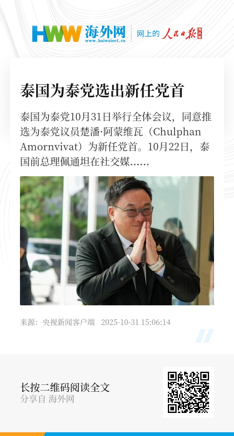 泰国为泰党10月31日举行全体会议,同意推选为泰党议员楚潘·阿蒙维瓦(Chulphan Amornvivat)为新任党首。
