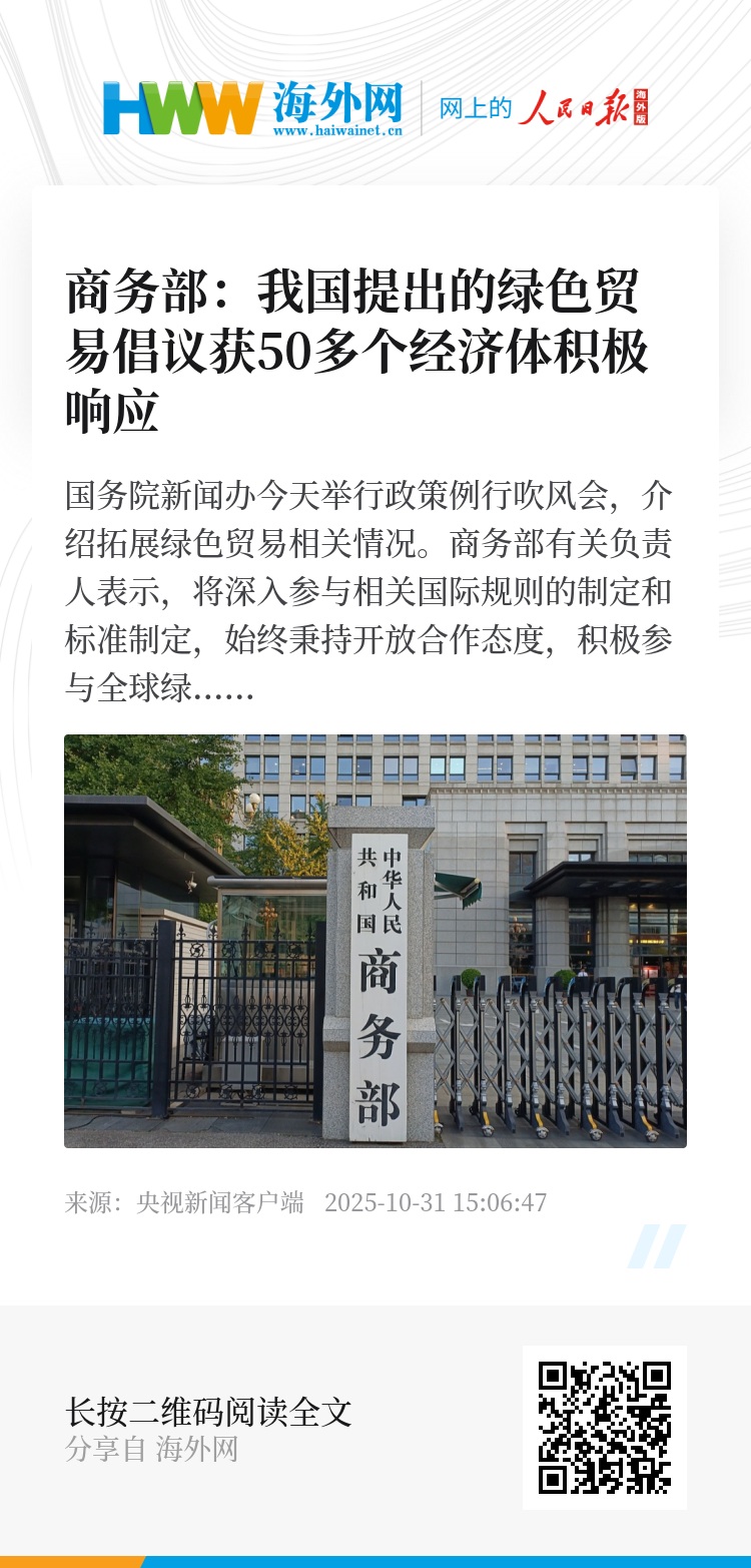 商务部有关负责人介绍,将在二十国集团、金砖国家、亚太经合组织、联合国贸发会议等重要的国际场合,积极参与绿色发展相关议题的讨论,主动分享中国实践和中国方案。