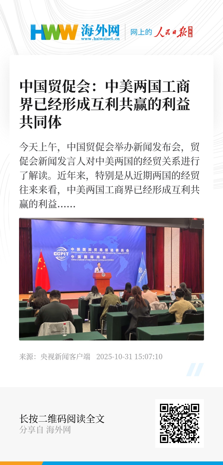 今天上午,中国贸促会举办新闻发布会,贸促会新闻发言人对中美两国的经贸关系进行了解读。近年来,特别是从近期两国的经贸往来来看,中美两国工商界已经形成互利共赢的利益共同体。