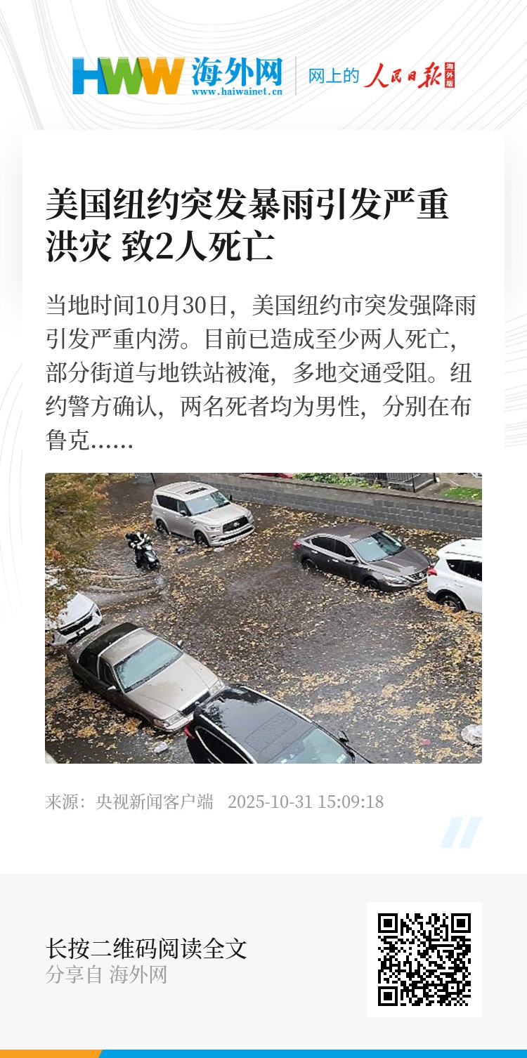 当地时间10月30日,美国纽约市突发强降雨引发严重内涝。目前已造成至少两人死亡,部分街道与地铁站被淹,多地交通受阻。
