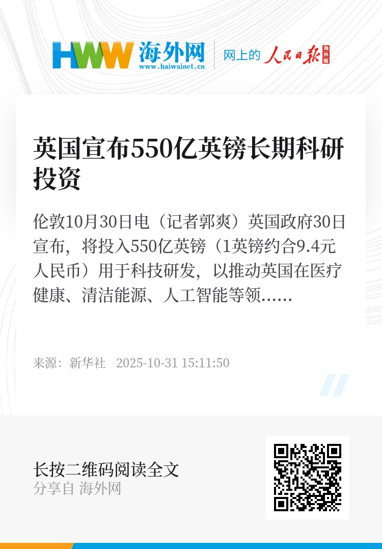 新华社伦敦10月30日电(记者郭爽)英国政府30日宣布,将投入550亿英镑(1英镑约合9.4元人民币)用于科技研发,以推动英国在医疗健康、清洁能源、人工智能等领域取得突破性进展。
