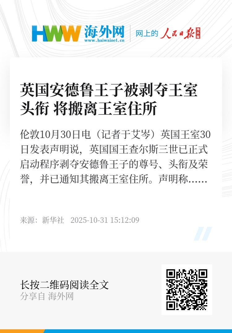 新华社伦敦10月30日电(记者于艾岑)英国王室30日发表声明说,英国国王查尔斯三世已正式启动程序剥夺安德鲁王子的尊号、头衔及荣誉,并已通知其搬离王室住所。
