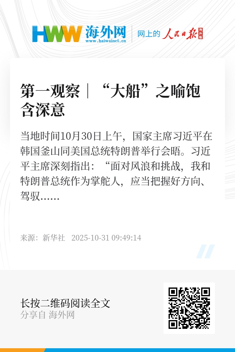 当地时间10月30日上午,国家主席习近平在韩国釜山同美国总统特朗普举行会晤。习近平主席深刻指出:“面对风浪和挑战,我和特朗普总统作为掌舵人,应当把握好方向、驾驭住大局,让中美关系这艘大船平稳前行。”