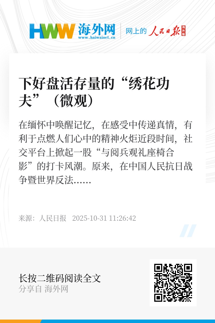 近5万把观礼座椅重新“上岗”,折射发展理念、治理智慧,也承载集体记忆、家国情怀。面向未来,我们要充分用好纪念活动激发的强大正能量,持续用好纪念活动这本生动的爱国主义教材。如此,方能将活动所激发的自信心、自豪感,转化为实实在在的奋斗,汇聚成推动发展的磅礴力量。(徐雷鹏)