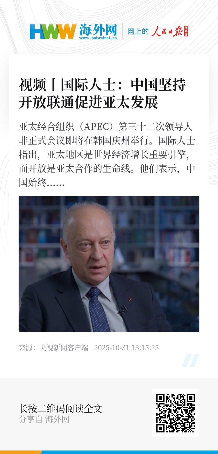 亚太经合组织(APEC)第三十二次领导人非正式会议即将在韩国庆州举行。国际人士指出,亚太地区是世界经济增长重要引擎,而开放是亚太合作的生命线。他们表示,中国始终是区域开放合作的坚定践行者。同时,中国在维护多边主义、坚持开放联通助力亚太地区发展方面,发挥着关键作用。