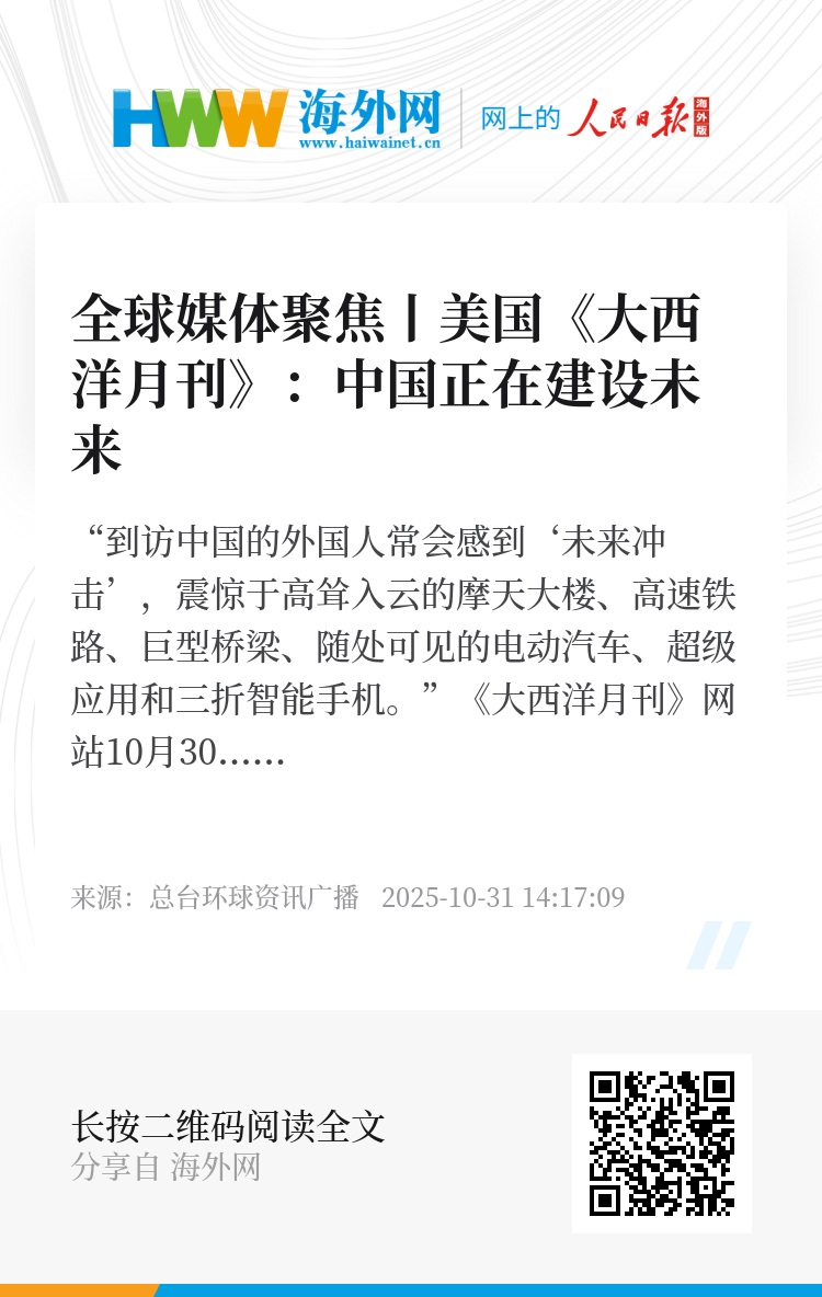 《大西洋月刊》网站10月30日发布的一篇题为《中国正在建设未来》的文章聚焦中国科技的发展,并认为,美国应该正视中国的优势,并在一些领域展开合作,实现互利共赢。