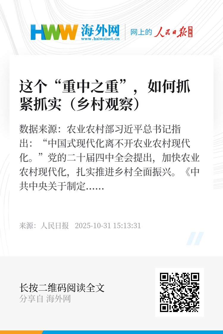习近平总书记指出:“中国式现代化离不开农业农村现代化。”党的二十届四中全会提出,加快农业农村现代化,扎实推进乡村全面振兴。《中共中央关于制定国民经济和社会发展第十五个五年规划的建议》(以下简称《建议》)强调,坚持把解决好“三农”问题作为全党工作重中之重,促进城乡融合发展,持续巩固拓展脱贫攻坚成果,推动农村基本具备现代生活条件,加快建设农业强国。