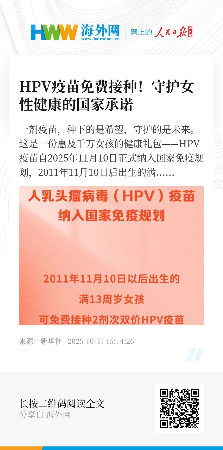 这是一份惠及千万女孩的健康礼包——HPV疫苗自2025年11月10日正式纳入国家免疫规划,2011年11月10日后出生的满13周岁女孩可以免费接种双价HPV疫苗。这不仅是降低我国宫颈癌疾病家庭负担的关键一步,更是推动全民健康的国家承诺。