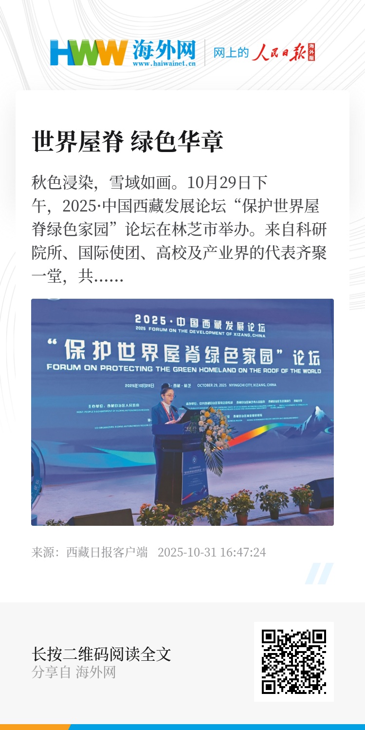 10月29日下午,2025·中国西藏发展论坛“保护世界屋脊绿色家园”论坛在林芝市举办。来自科研院所、国际使团、高校及产业界的代表齐聚一堂,共话西藏生态保护成就,共谋绿色发展未来,共绘人与自然和谐共生的美好蓝图。