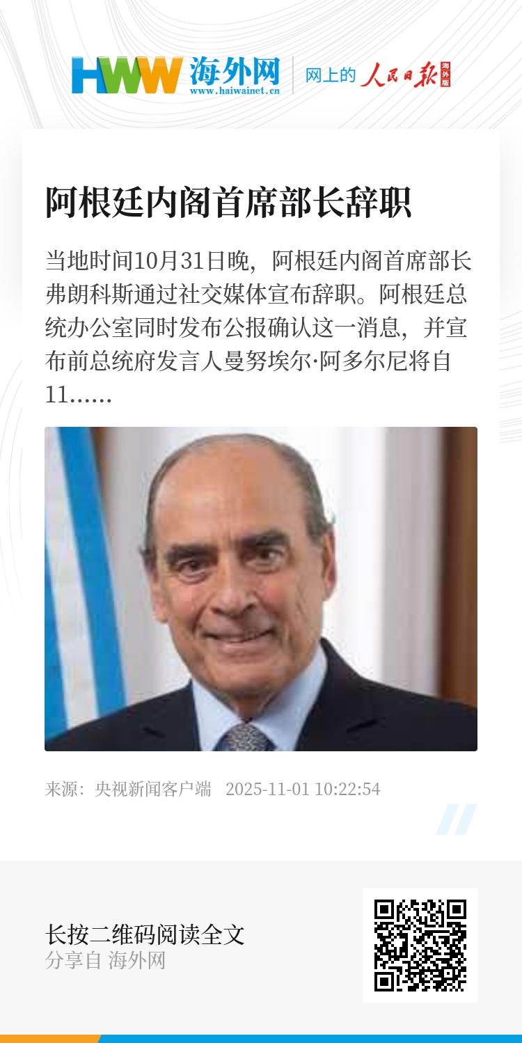 阿根廷总统办公室同时发布公报确认这一消息,并宣布前总统府发言人曼努埃尔·阿多尔尼将自11月3日起接任内阁首席部长一职。(总台记者 宫祥诚)