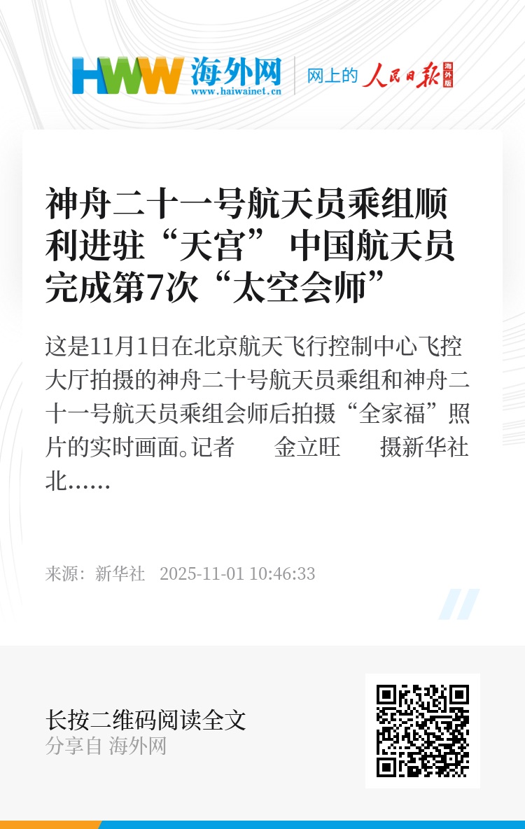 新华社北京11月1日电(记者高蕊)据中国载人航天工程办公室消息,在载人飞船与空间站组合体成功实现自主快速交会对接后,神舟二十一号航天员乘组从飞船返回舱进入轨道舱。北京时间2025年11月1日4时58分,在轨执行任务的神舟二十号航天员乘组顺利打开“家门”,欢迎远道而来的神舟二十一号航天员乘组入驻中国空间站,这是中国航天史上第7次“太空会师”。两名指令长继三年前首次“太空会师”后再度相聚“天宫”。随后,两个航天员乘组拍下“全家福”,共同向牵挂他们的全国人民报平安。
