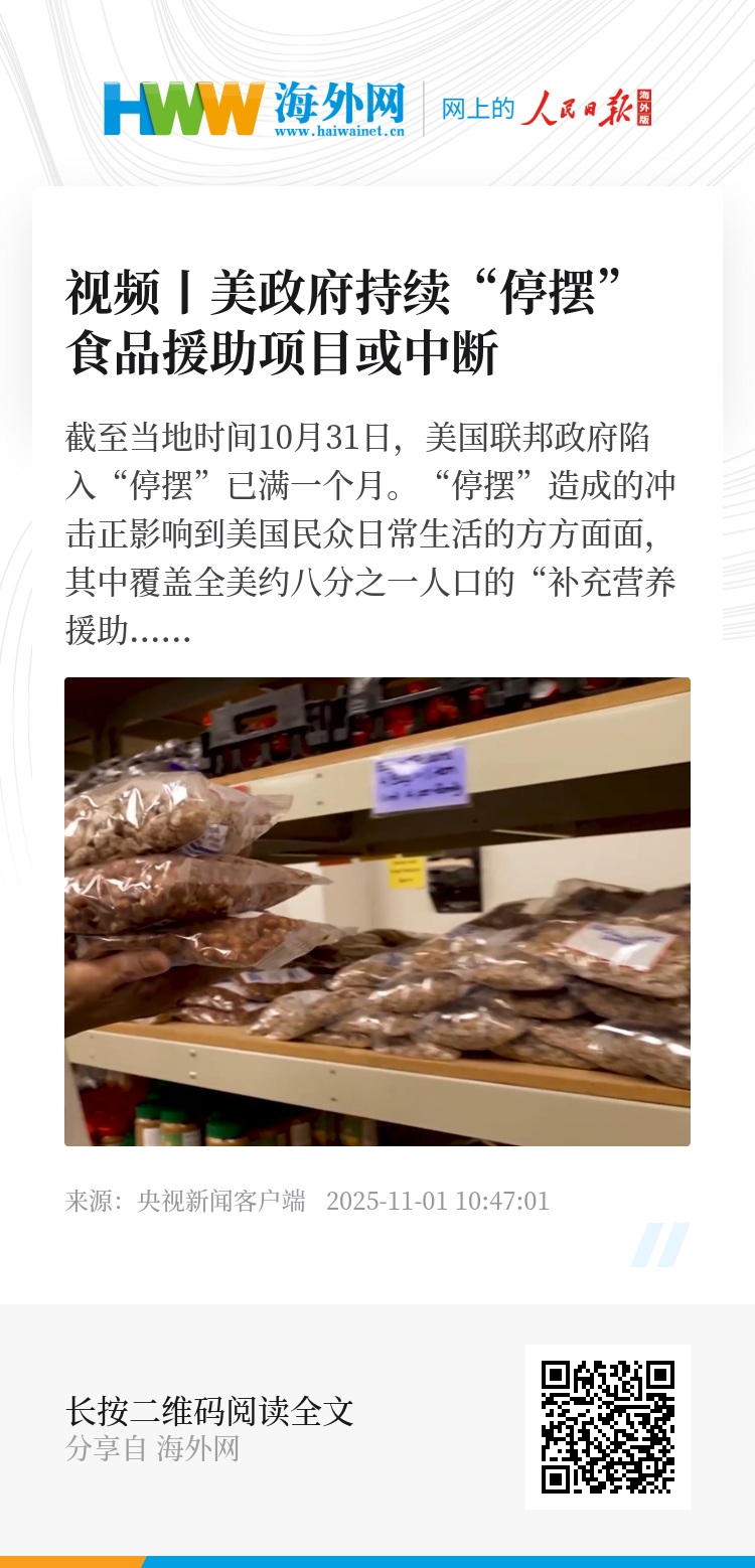 截至当地时间10月31日,美国联邦政府陷入“停摆”已满一个月。“停摆”造成的冲击正影响到美国民众日常生活的方方面面,其中覆盖全美约八分之一人口的“补充营养援助计划”于10月31日资金耗尽,而联邦政府从11月1日起停止发放相应资金。
