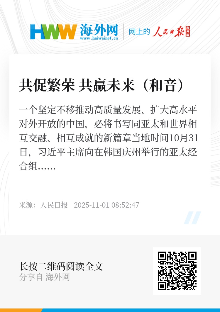 中国是亚太大家庭的负责任一员,不断以自身的新发展为亚太和世界经济带来更多稳定性和确定性。多年来,中国一直是世界经济增长的主要贡献者。“十四五”期间,中国经济实现5.5%左右的平均增速,对全球经济增长的贡献率稳定在30%左右。中国经济有着稳健运行的坚实基础,市场空间大、成长预期好,能够为全球工商界提供更多发展机遇。中国绿色化、数字化、智能化产业加快发展,为全球工商界提供宽广创新舞台。事实证明,中国是全球工商界理想、安全、有为的投资目的地,“与中国同行就是与机遇同行”早已成为国际社会的普遍共识。中共二十届四中全会审议通过“十五五”规划建议,为未来5年的中国发展作出战略擘画,中国将坚定推进高水平对外开放,进一步放宽市场准入,持续优化营商环境。一个坚定不移推动高质量发展、扩大高水平对外开放的中国,必将书写同亚太和世界相互交融、相互成就的新篇章。