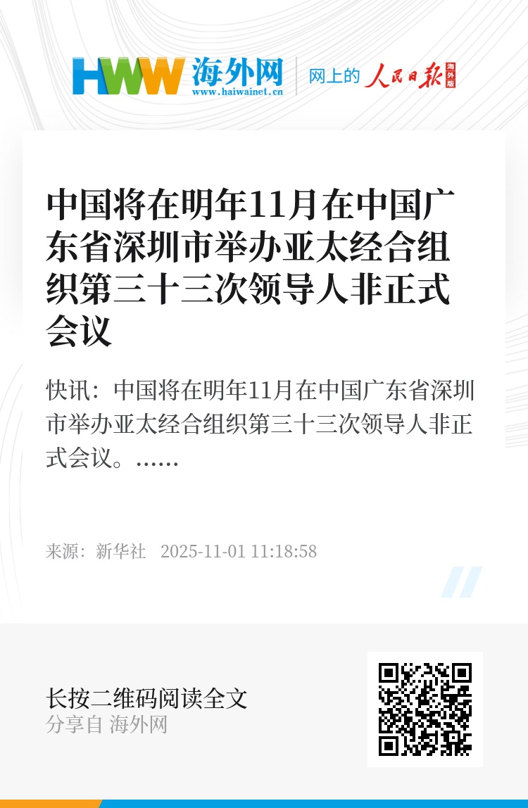 新华社快讯:中国将在明年11月在中国广东省深圳市举办亚太经合组织第三十三次领导人非正式会议。