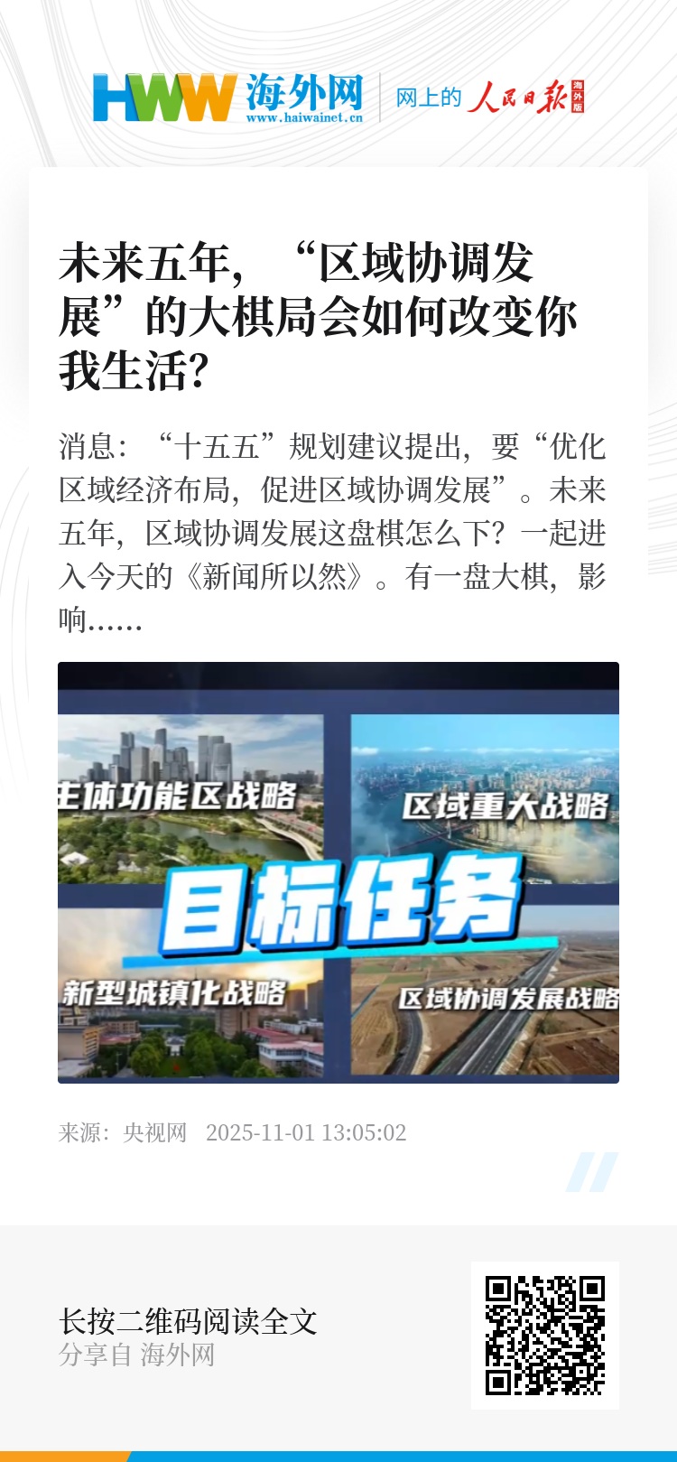 央视网消息:“十五五”规划建议提出,要“优化区域经济布局,促进区域协调发展”。未来五年,区域协调发展这盘棋怎么下?一起进入今天的《新闻所以然》。