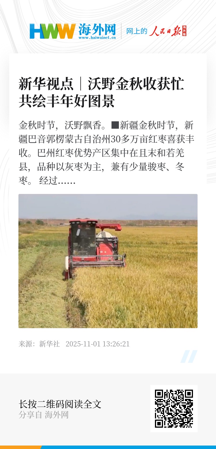 金秋时节,新疆巴音郭楞蒙古自治州30多万亩红枣喜获丰收。巴州红枣优势产区集中在且末和若羌县,品种以灰枣为主,兼有少量骏枣、冬枣。 经过二十多年发展,红枣不但成为当地农民增收的重要支柱产业,还有效阻挡了塔克拉玛干沙漠风沙,起到生态屏障的作用。