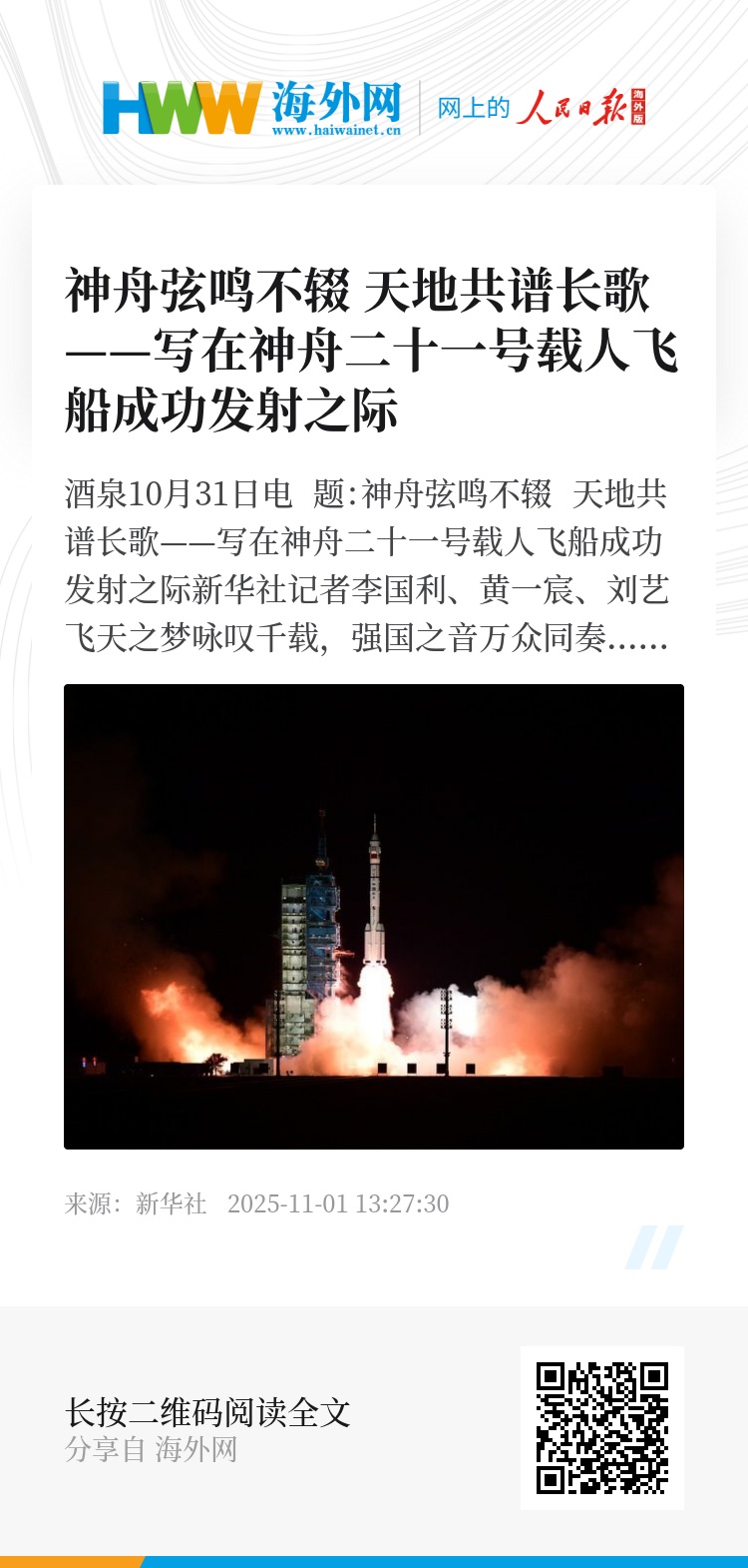 新华社酒泉10月31日电 题:神舟弦鸣不辍 天地共谱长歌——写在神舟二十一号载人飞船成功发射之际