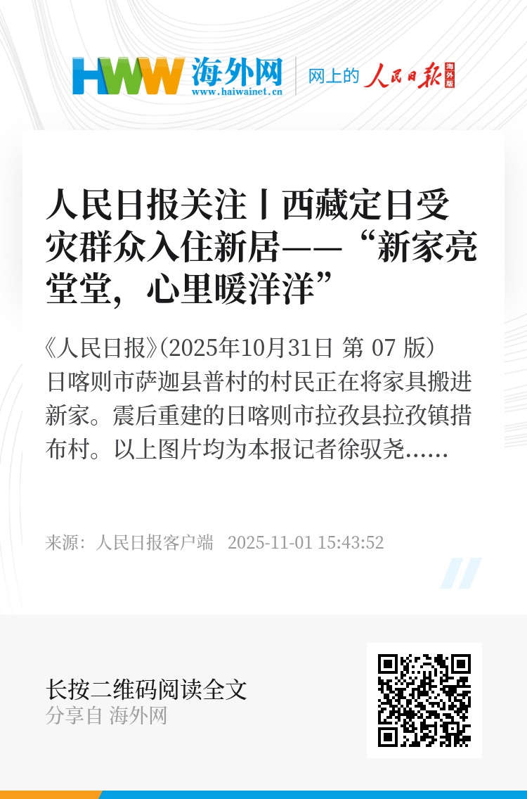 据介绍,此次灾后恢复重建共涉及西藏7个县47个乡镇486个村,重建民房共计2.2万余户、面积310万平方米,维修加固民房共计1.05万余户、加固面积106万平方米。“我们加紧建设,切实保障群众温暖过冬。”日喀则市相关负责同志说。